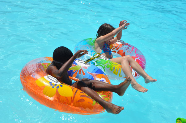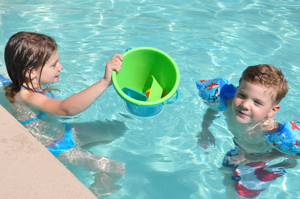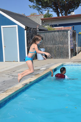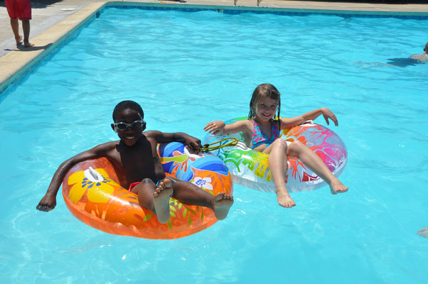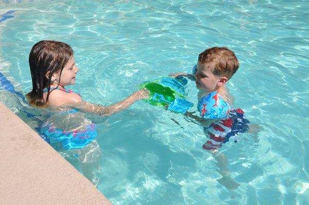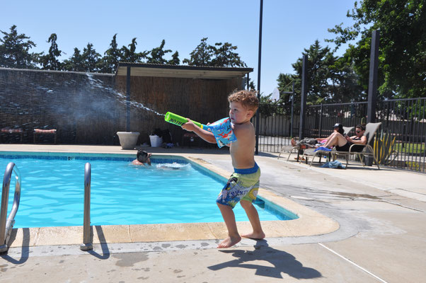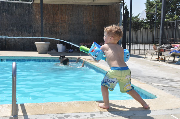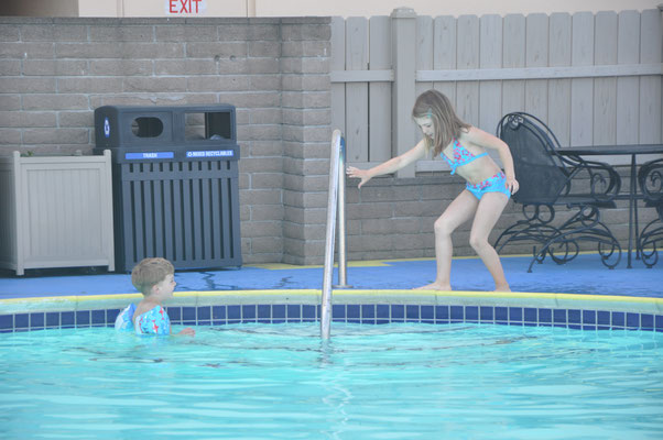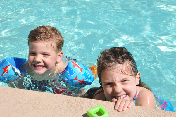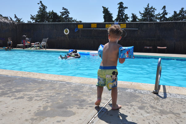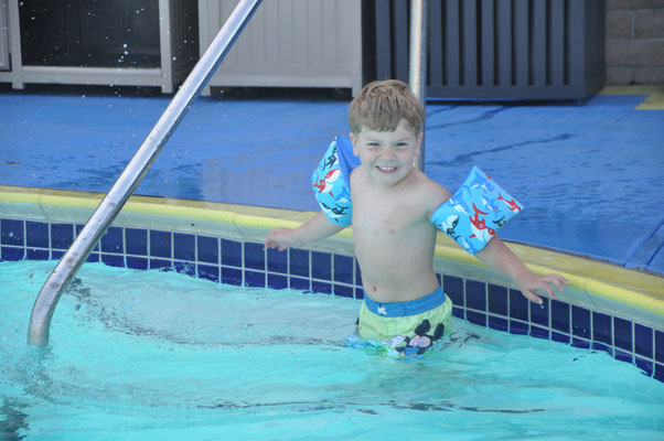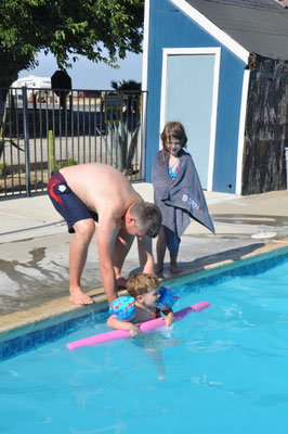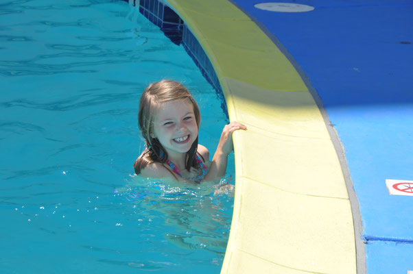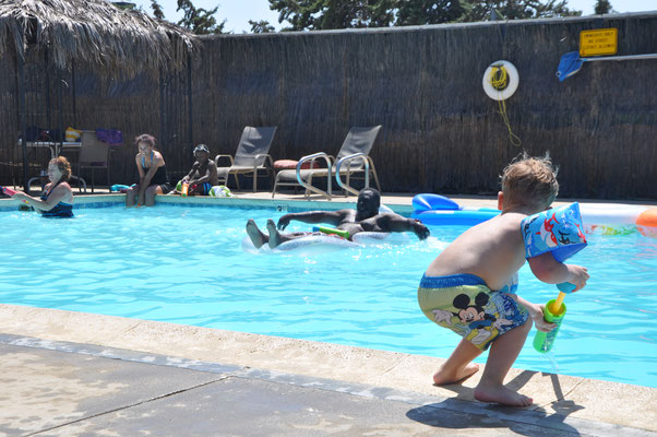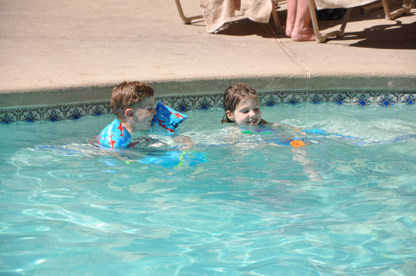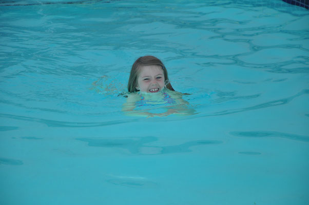 Vor dem Morgenessen ging Claudia noch einen Kilometer schwimmen. Mike wollte es ihr danach gleiechtun, nahm aber die Kinder mit auf den neben dem Pool gelegenen Spielplatz. Nach 200 Meter Schwimmen standen die Kinder in den Badsachen neben dem Pool und aus dem Kilometer wurde nichts mehr...