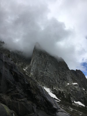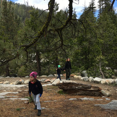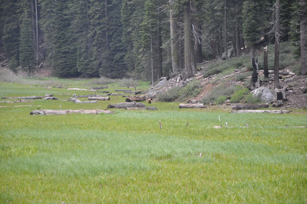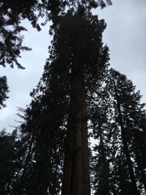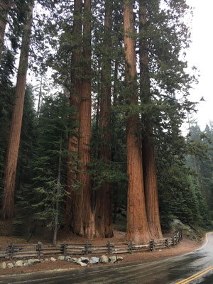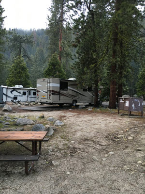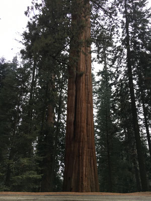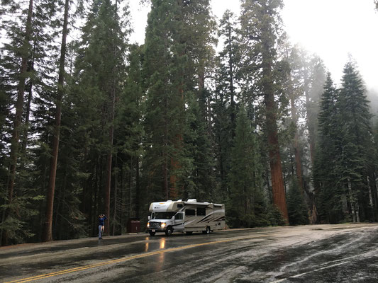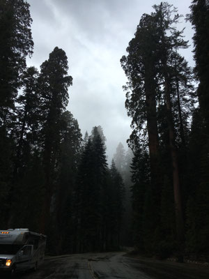 Vom KOA Campground Lake Isabella fuhren wir am Morgen zeitig los und kamen dann auch am eigentlichen See vorbei (ein Stausee) und weiter durch eine sehr schöne Schlucht mit dem Kern River. In Porterville stockten wir die Vorräte auf, schauten kurz (und per Zufall) im Veterans Park vorbei und fuhren weiter hinauf in die Berge zum Südeingang des Sequoia National Park. Das Aha-Erlebnis kam an der Rangerstation: unser WoMo sei zu lang für die Strecke rein in den Park.... Das stand nirgends geschrieben. Nun denn, zurückfahren und 2 Stunden Umweg verdauen. Im Regen und Nebel fuhren wir dann hinauf zum anderen Parkeingang. Durch den King Canyon kamen wir nun also in den Seqouia und sahen schon bald die ersten Sequoia-Tannen. Riesig! Wir tankten in der Stony Creek Lodge und wurden informiert, dass Schnee in der Nacht erwartet werde... Dann fuhren wir weiter zu unserem Camping, dem Lodgepole Campground. Es war übrigens der erste Tag der neuen Saison und der Campground öffnete gerade seine Tore. Auf dem Weg dann war ER da, der erste Schwarzbär! Zwar war er braun, aber die Bären im Sequoia können von weiss bis schwarz verschiedenste Farben haben. Da waren wir also wieder im Bärenland und diesmal war es wirklich so. Es sollt nicht der einzige Bär bleiben. Der Lodgepole Campground war sehr schön und wir grillierten trotz schlechtem Wetter und vereinzelter Schneeflocken.