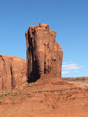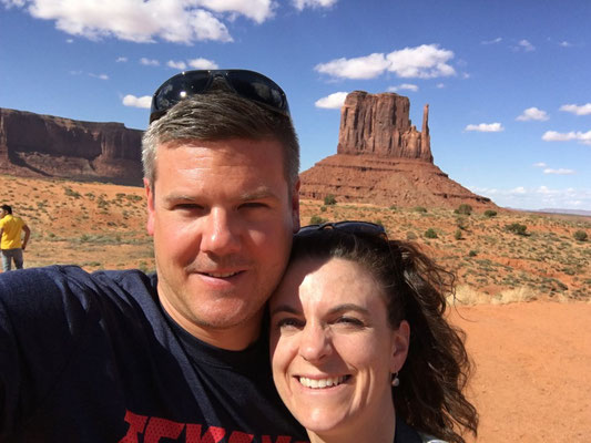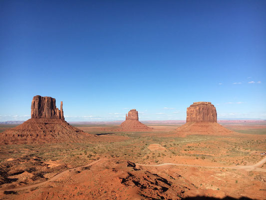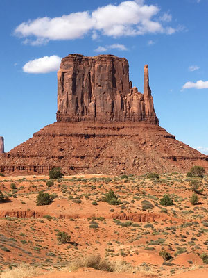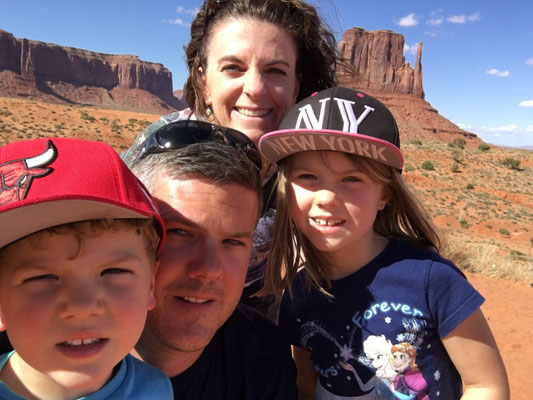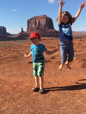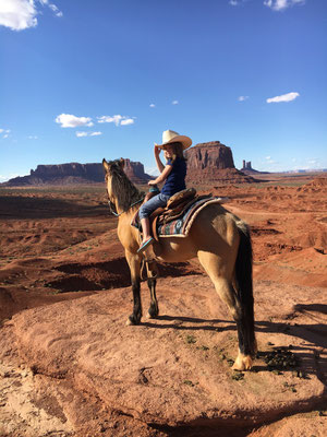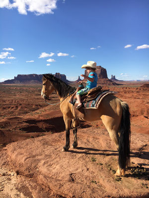 Dann bot sich uns nach langer Fahrt ein wunderbarer Anblick. Vor uns lag das Monument Valley. Nach dem Entrichten des Eintritts fuhren wir rein in dieses Indianergebiet. Unser Jeep meisterte die 27 Meilen lange Dirt Road ohne Probleme. Unterwegs stiegen wir ein paar Male aus. Die Kinder setzten sich am John Ford Point auf ein Pferd wie es der "Duke" in einigen Western auch getan hatte. Alessia absolvierte die Fotosession in bester John Wayne Manier, Valerio wurde kein Freund des Pferdes...