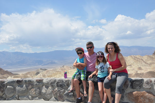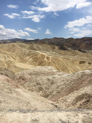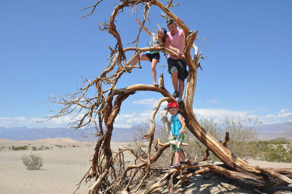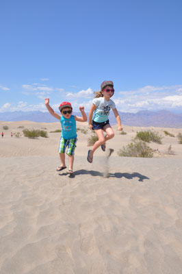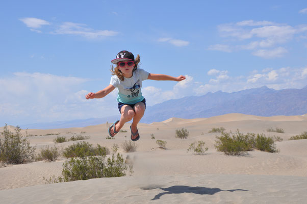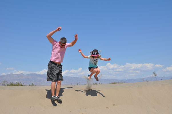Erfrischt und gestärkt machten wir uns auf zum Zabriskie Point, dem berühmten Aussichtspunkt des National Parks. Via Visitor Center und Mesquite Flats Sand Dunes verliessen wir das Death Valley. Die Mesquite Flats Sand Dunes liegen etwas nördlich des Highway 190 östlich von Sovepipe Wells Village. Wenn man das Death Valley durchquert kommt man zwangsläufig an ihnen vorbei. Man erkennt sie schon von weitem, besser gesagt die größte der Dünen. Die Star Dune liegt zentral in dem Sandfeld an der Stelle, wo der Wind den Sand ständig auftürmt. Wir nutzen die Dünen als Rastplatz zum Austoben!