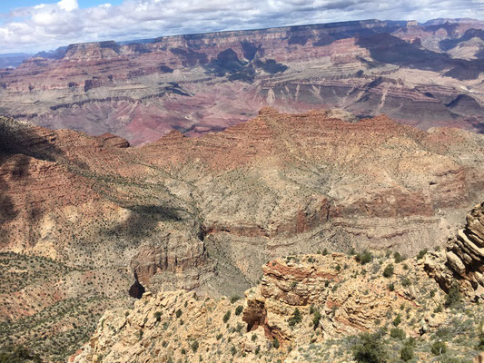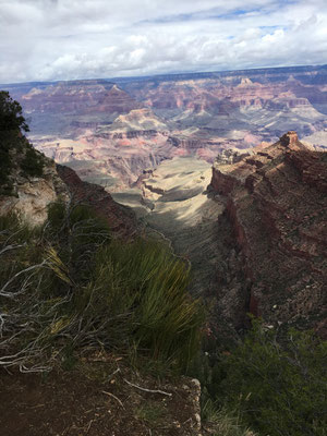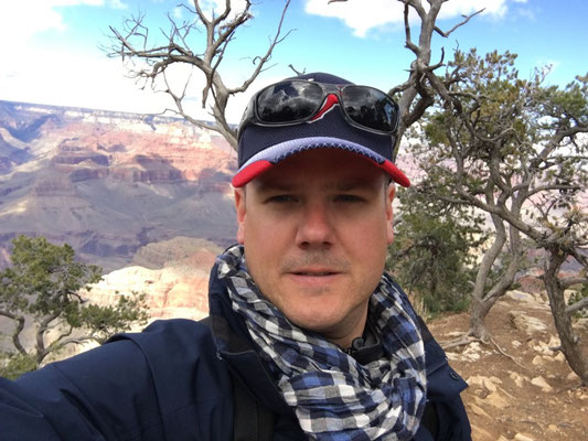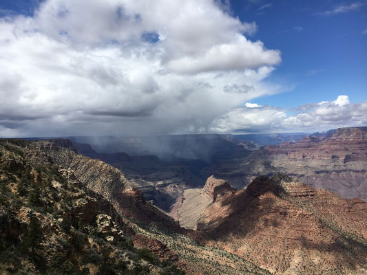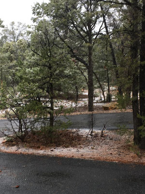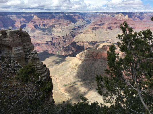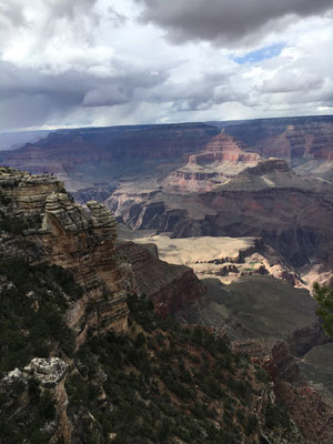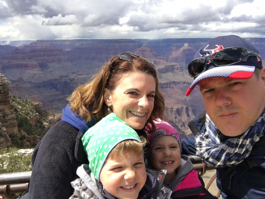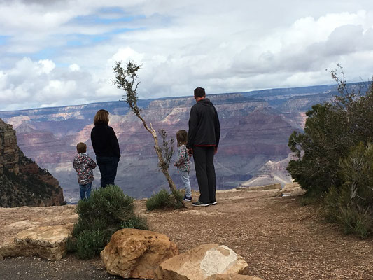Die Nacht war eiskalt. Aber trotzdem staunten wir nicht schlecht, als wir beim Erwachen und dem ersten Blick durchs Fenster Schnee sahen. Es schneite tatsächlich... Nun mussten die Winterkleider nach New York erneut hervorgeholt werden. Der Schnee liess nach und bei Regen liefen wir los zum Shuttle, das uns an den South Rim des Canyon brachte. Nach dem Besuch des Visitor Center liess sich sogar die Sonne blicken und wir liefen der Krete des Canyons entlang. Gegen Abend kamen wir nach Hause und verzichteten aufs Grillieren. Wir hatten übrigens den Standplatz wechseln müssen, den Camper aber nur wenig bewegt. Es wurde erneut eiskalt und das tat offenbar der Batterie nicht gut. Dass die mit dem Kohlen-Monoxid-Melder verbunden ist, mussten wir dann lernen, als ein sich alle dreissig Sekunden wiederholender Pfeifton losging. Es blieb uns nichts anderes übrig, als das Wohnmobil komplett "vom Netz" zu nehmen... Die Nacht wurde lang, sehr lang ohne Heizung....