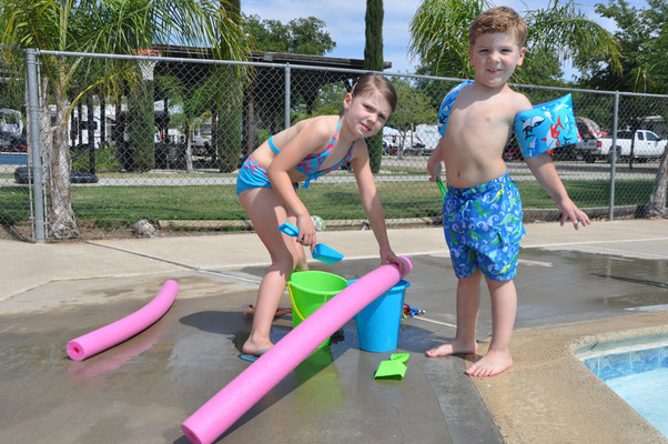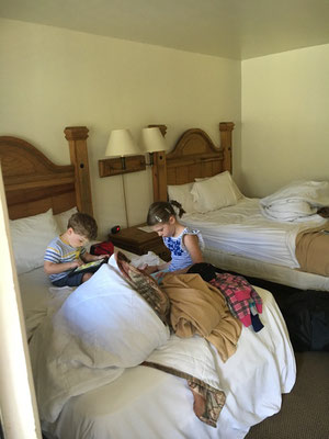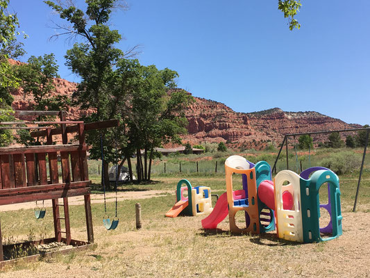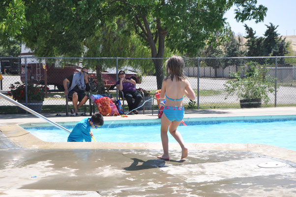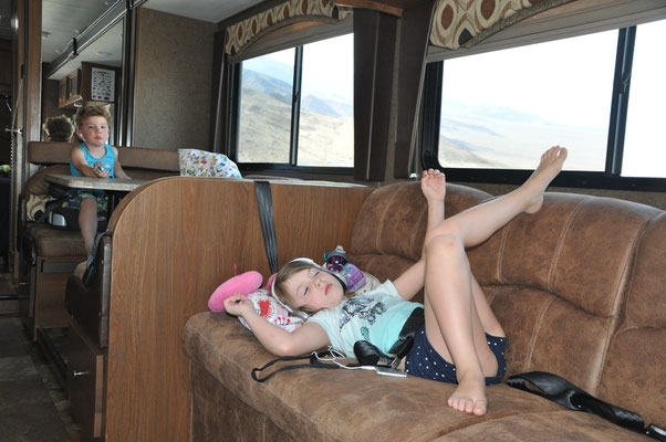 Während die Grossen am Morgen die üblichen Vorbereitungen zur Weiterfahrt trafen, spielten die Kinder auf dem Spielplatz. Dabei entstand ein Foto, dass gut die verschiedenen Prioritäten aufzeigt. Während für Claudia und Mike die Landschaften im Zentrum des Interesse standen, war es den Kindern vor allem wichtig, Spielplätze und Swimming Pools zu haben (und Casinos, aber dazu später...).