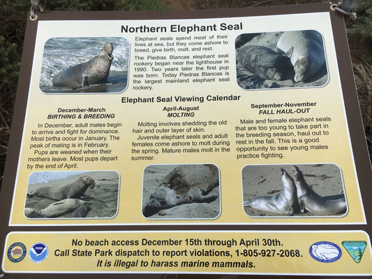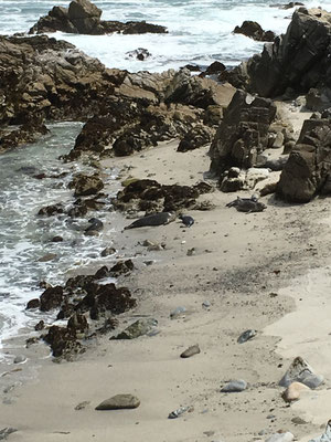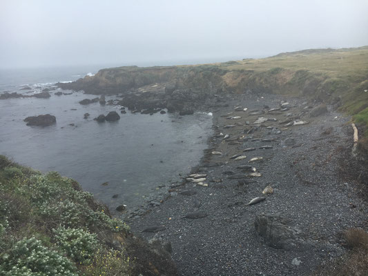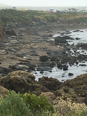 Am Morgen war es verhangen und dann kam der Regen. Gerade in dem Moment, als wir den Strand bei San Simeon, Piedras Blancas, erreichten. Entsprechend waren nur Claudia und ich motiviert, die Tiere zu beobachten. Alessia und Valerio wollten lieber im WoMo spielen, kamen aber dann doch noch kurz mit. Die Tiere waren faszinierend.
