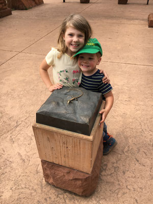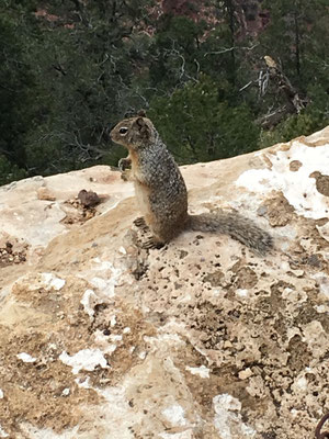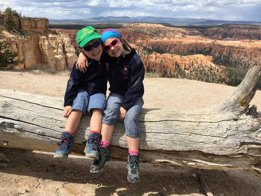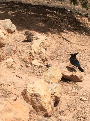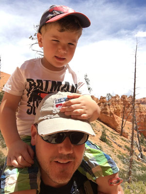 Nach dem Morgenessen fuhren wir mit dem Shuttle zum Rand des Bryce Canyon und liefen los auf dem Navajo Trail rein in die Felsformationen des Bryce. Steil ging es runter und beim ersten Stopp beobachteten wir einen Vogel und einen Nager, die sich um das Futter stritten. Dann ging es weiter vorbei an verschiedenen Formationen wie etwa der Königin Elisabeth (man suche auf den Fotos). Valerio ging es plötzlich nicht mehr gut und er bekam Fieber. So wanderte er auf den Schultern von Papa weiter. Wir hängten noch den Garden Trail an und dann fuhren wir zurück zum WoMo. Alessia und Mike gingen noch kurz einkaufen und den Waschsalon inspizieren. Valerio ging fiebrig ins Bett und kam nur noch kurz fürs Z'Nacht und ein Zäpfli raus.