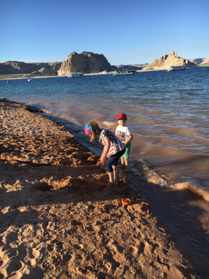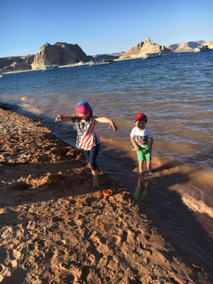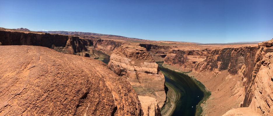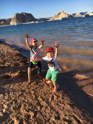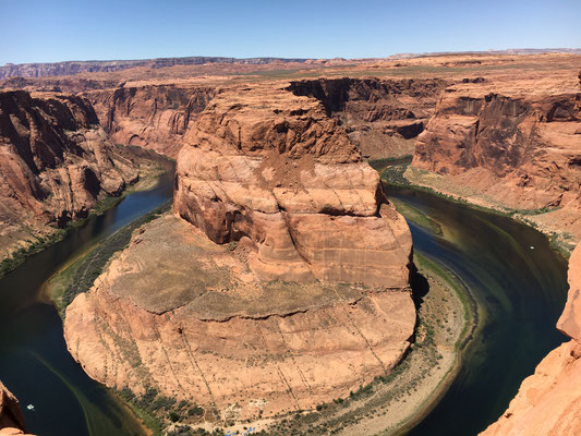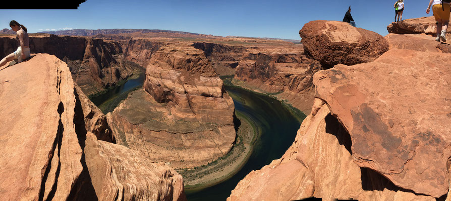 Nach einem kurzen Marsch kamen wir beim Horseshoe Bend an. Der Colorado hat eine Kurve in das Gestein gewaschen und ungesichert steht man plötzlich am Abgrund. Erstaunlich, wie fahrlässig sich die Menschen am Abgrund bewegen für ein gutes Foto. Wir waren vorsichtig und liessen die Kinder in genügend grossem Abstand warten und machten unser Foto.