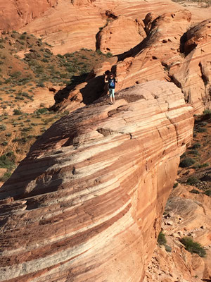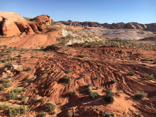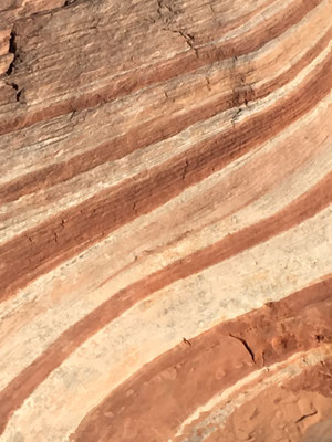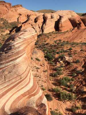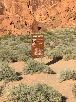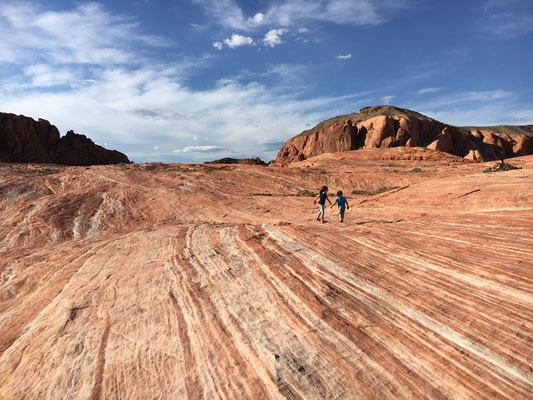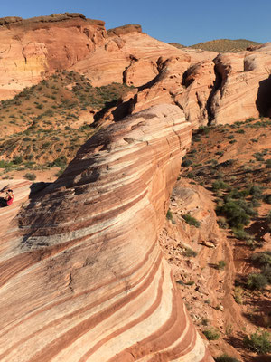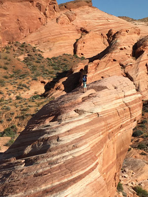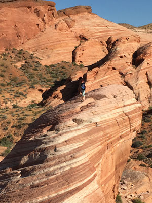 Am Morgen verliessen wir den Zion National Park und fuhren los nach Las Vegas. Trotz langer Fahrt machten wir noch den Abstecher ins Valley of Fire. Die Wanderung zur Fire Wave brachte uns zu dieser farbigen Felsformation (die auch auf der Titelseite unseres Reise-Knowhow-Führers abgebildet war). Trotz der brütenden Sonne war die Wanderung erträglich, da auch ein ziemlich starker Wind blies.