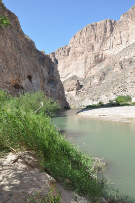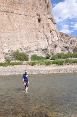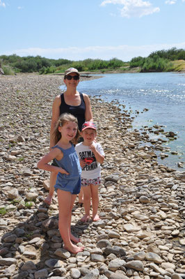 Mit dem Auto fuhren wir danach in Richtung des Rio Grande und der mexikanischen Grenze. Weil es schon etwas später am Nachmittag war, verzichteten wir auf den Grenzübertritt und den Besuch des mexikanischen Dorfes Boquillas. Stattdessen fuhren wir zum Boquillas Canyon und wanderten zum Eingang dieses Canyons. Der Weg führte am Rio Grande entlang. Die Sonne brannte auf uns nieder und Alessia hatte eine grosse "Hitzekrise". Zwecks Abkühlung lief Mike zum Fluss um die Möglichkeit einer Abkühlung zu prüfen. Der Rio Grande war an dieser Stelle nur knietief und so zogen wir unsere Wanderschuhe aus und überquerten den Fluss. Mexiko, da waren wir. Unser erster Besuch in diesem Land (zum Glück war der Donald nicht da und auch seine Mauer noch nicht...).