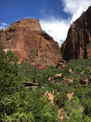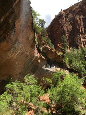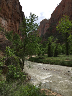 Springfluten (Flash floods) war der Trail geschlossen. Vor 16 Jahren waren wir noch in die Narrows reingewandert, zum Teil bis zum Bauch im Wasser. Wir wanderten wieder zurück und