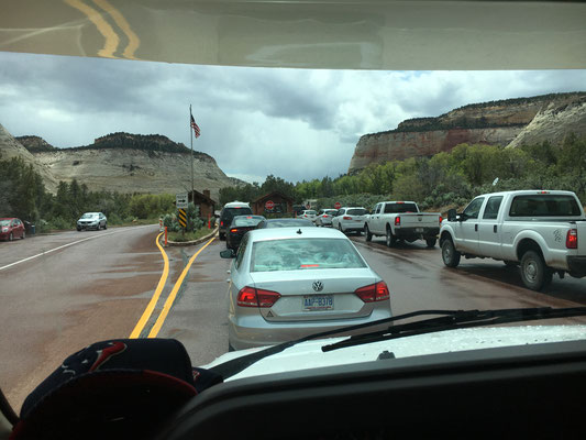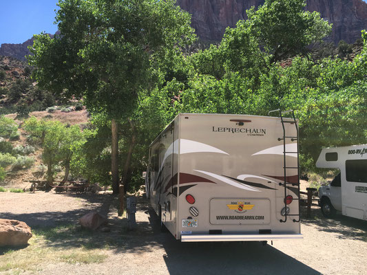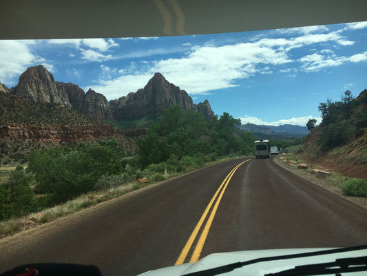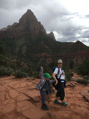 Mit einer beeindruckenden Kulisse im Hintergrund (ein Gewitter erreichte gerade den Bryce Canyon und Blitze zuckten durch den Himmel) fuhren wir los zum Zion National Park. In Orderville stockten wir die Vorräte auf und weiter ging es durch eindrückliche Landschaften, zuerst im Regen und dann wieder ohne. Nach dem Passieren des üblichen Ranger Eingangsposten mussten wir noch durch einen Tunnel fahren. Dies war für WoMos nur im Konvoi möglich und so fuhren wir nach kurzem Warten als zweites Wohnmobil durch den Tunnel und kamen im Zion Valley wieder heraus. Einmal mehr erwies es sich als gut, dass wir den Campground schon vor reserviert hatten. Die Site lag schön am Virgin River. Die Kinder und Mike gingen noch baden im Pool, der aber auch für die Wasserratten Valerio und Alessia eine Spur zu kalt war.