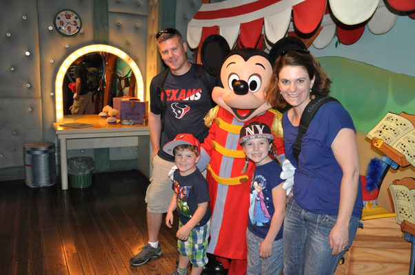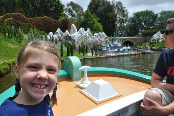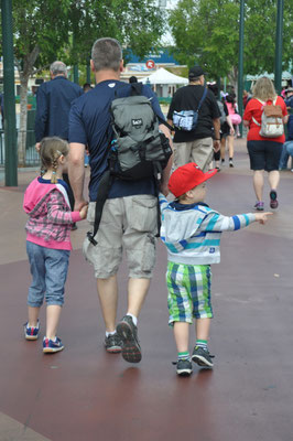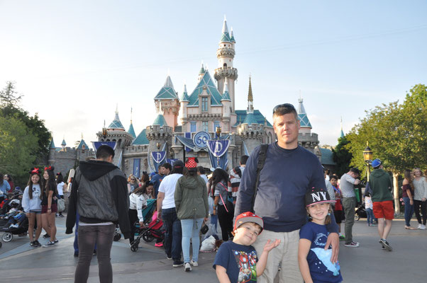 Mit dem Shuttle fuhren wir also hin zum Disneyland. Menschenmassen, die meisten mit einem Mickey-T-Shirt oder Mickey-Ohren auf dem Kopf, strömten durch die Eingangspforten hinein. Wir suchten zuerst etwas essbares mit mehr oder weniger Erfolg. Valerio ass ein grosses Cookie (in Mickey-Form, was denn sonst), wir einen Kaffee und Alessia bekam die Krise. Das Essen in den USA ist so eine Sache.