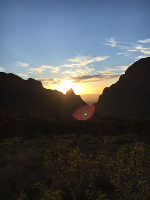 Bei 40 Grad marschierten wir zurück zum Auto und fuhren mit einem kleinen Erfrischungsstopp heim in die Lodge. Der Sonnenuntergang war wieder wunderschön.