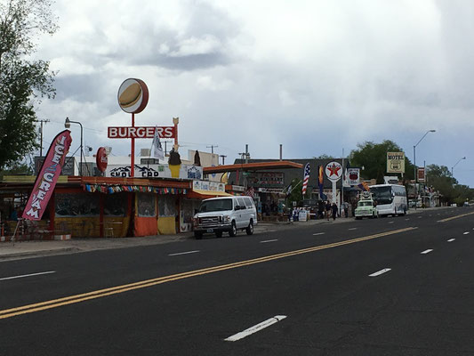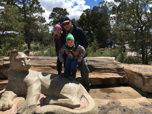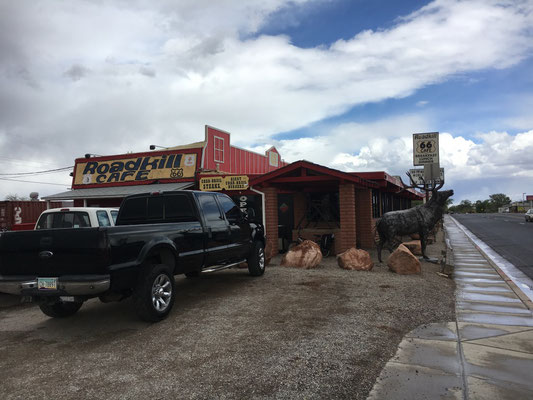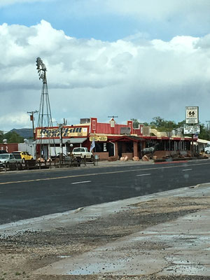 Nach einer ruhigen Nacht auf der Blake Ranch wurden die Vorräte auf einer Autobahnraststätte mehr schlecht als recht ergänzt. Dafür war die Deko der Raststätte umso fantasievoller und pathetisch (siehe Bilder). Einen Rast legten wir in Seligman, einer alten Route 66-Ikone, ein. Dann ging es zügig mit Regen gegen den Grand Canyon zu. Wir hatten auf dem Mather Campground reserviert. Wir grillierten und erlebten die erste Nacht im Nationalpark bei frostigen Temperaturen. Da wussten wir noch nicht, was uns alles noch blühte...