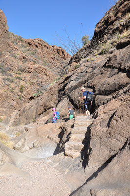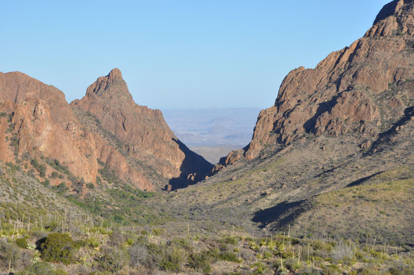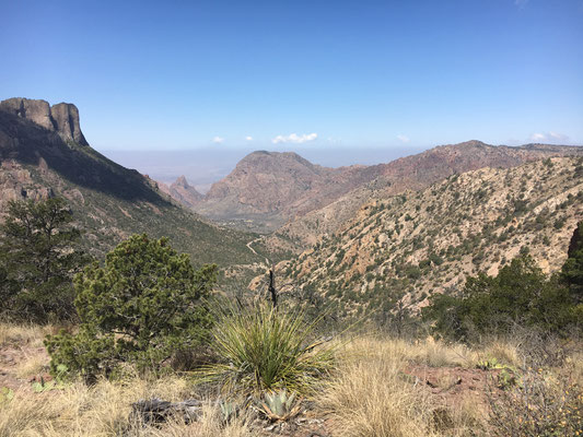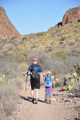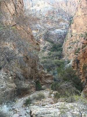Nicht ganz so früh, aber auch nicht zu spät, liefen wir von unserer Lodge aus auf dem Window Trail los. Der Trail war als Wanderung durch einen Canyon sprich am Fluss entlang beschrieben. Nur war in diesem Frühling Wasser im Big Bend generell eine Mangelware... Trotzdem führte die Wanderung hinein in den Canyon bis zu einer Stelle, an der der Canyon sich gegen ein Tal hin öffnete. Hier wäre, Wasser vorausgesetzt, ein Wasserfall tief in das davor liegende Tal hinuntergestürzt.
