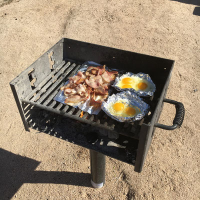 Am Morgen war das Erwachen wie gesagt fantastisch! Der Joshua Tree ist ein eindrücklicher Nationalpark. Mike schlich sich früh raus und während alle anderen noch schliefen, wurde der Grill angeworfen und Eier mit Speck gebraten.