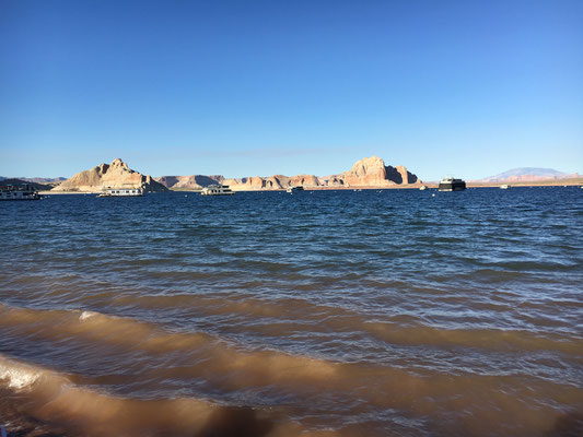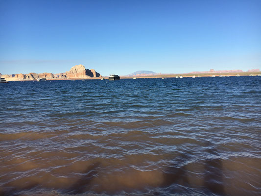 Mit mehreren Stopps dem Grand Canyon entlang machten wir uns auf den Weg nach Page am Lake Powell. Unterwegs übernahmen wir in Flagstaff das reservierte Mietauto und fuhren im Konvoi Richtung Page. Einen Stopp legten wir im Cameron Trading Post ein. Dieser Laden hat einiges an indianischem Kunstschaffen zu bieten. Und so kam es, dass wir wieder im Dunkeln unseren Campground am Lake Powell aufsuchten. Der Wahweap Campground sollte seine attraktive Lage erst am nächsten Morgen offenbaren.