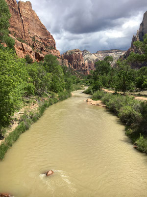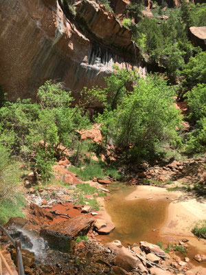 hat einen kleinen Strand. Dann ging es zurück zur Zion Lodge wo wir den Shuttle bestiegen und ganz nach hinten ins Tal fuhren. Ein einstündiger Fussweg entlang des Virgin Rivers (mit einem jungen
