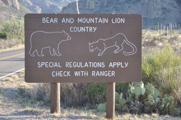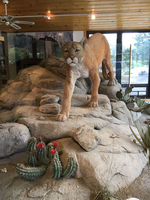 Vor der Abfahrt schauten wir noch beim Big Bend Visitor Center vorbei. Auf einer Landkarte waren die Bären- und Puma-Sichtungen der letzten Tage eingetragen. Wir sahen weder den einen noch den anderen, aber es war eine Bärenmutter mit drei Jungtieren unterwegs und auch Pumas waren gesichtet worden. Unseren Puma sahen wir nur im Visitor Center, waren bei dessen Anblick aber froh, dass die reale Begegnung nie stattfand!