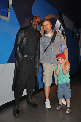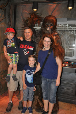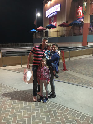 Wir fanden dann doch noch etwas für unsere Prinzessin und machten uns auf, die Attraktionen zu besuchen. Zuerst kamen die Herren in Genuss des Star Wars Areal. Der Simulatorflug mit dem Raumschiff fand aber nur einer lustig... "Papa, das war eine gaaanz doofe Idee...". Das Meet& Greet mit Chewbacca fanden dann die Kinder wiederum sehr lustig und auch die Jedi-Akademie, wo die kleinen Jedi-Schüler mit Darth Vader und Kylo Ren zu kämpfen hatten. Weiter gings zu Fuss, mit dem Schiff oder mit dem Bähnli. Dann besuchten wir noch Mickey Maus in seinem Haus (er war zuhause, siehe Bildergalerie). Gegen Abend kam dann das lang erwartete SMS: Götti Chrigu war gelandet und auf dem Weg zu unserem RV. Wir machten uns auch auf den Heimweg und fanden Chrigu in unserem WoMo vor. Wir kochten noch etwas und Mike musste dazu den Campground verlassen. Die Gegend war uns vom letzten Mal her (vor 16 Jahren!) nicht als die beste bekannt. So war es auch diesmal... Kam aus dem RV Park raus, explodierte vor Mikes Nase ein Pick-Up und ging in Flammen auf. Schnell war der Weg in den Supermarkt um die Ecke zurückgelegt und mit dem wenigen Schulspanisch war der Einkauf dann auch möglich. Wir assen und schliefen das erste Mal zu 5 im Wohnmobil.