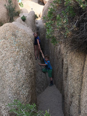 Nach dem Zmorge machten wir uns gestärkt auf den Weg, den Park auf ein paar Trails zu erforschen. Ein erster Weg führte uns zum Barker Dam. Diese kleine Staumauer wurde von Cowboys errichtet. Ja, im Joshua Tree gab es früher zwei Ranches. Die zweite kleine Wanderung führte uns ins Hidden Valley, wo Viehdiebe früher das gestohlene Vieh versteckten (cattle rustlers' hideout).